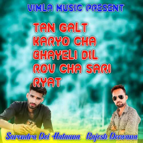Tan Galt Karyo Cha Bhayeli Dil Rov Cha Sari Ryat is a Rajasthani album released in 2024. There is one song in Tan Galt Karyo Cha Bhayeli Dil Rov Cha Sari Ryat. The song was composed by talented musicians such as surendra doi hatauna and Rajesh Deewana. Listen to all of Tan Galt Karyo Cha Bhayeli Dil Rov Cha Sari Ryat online on JioSaavn.